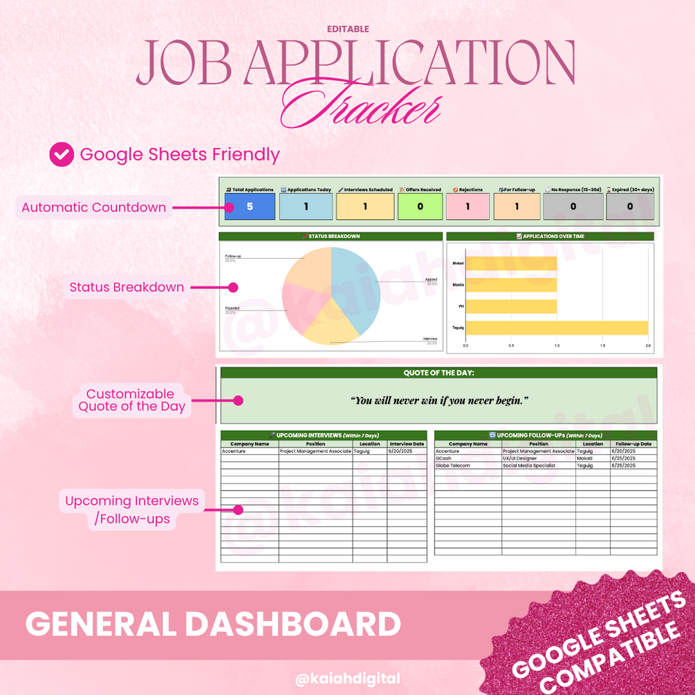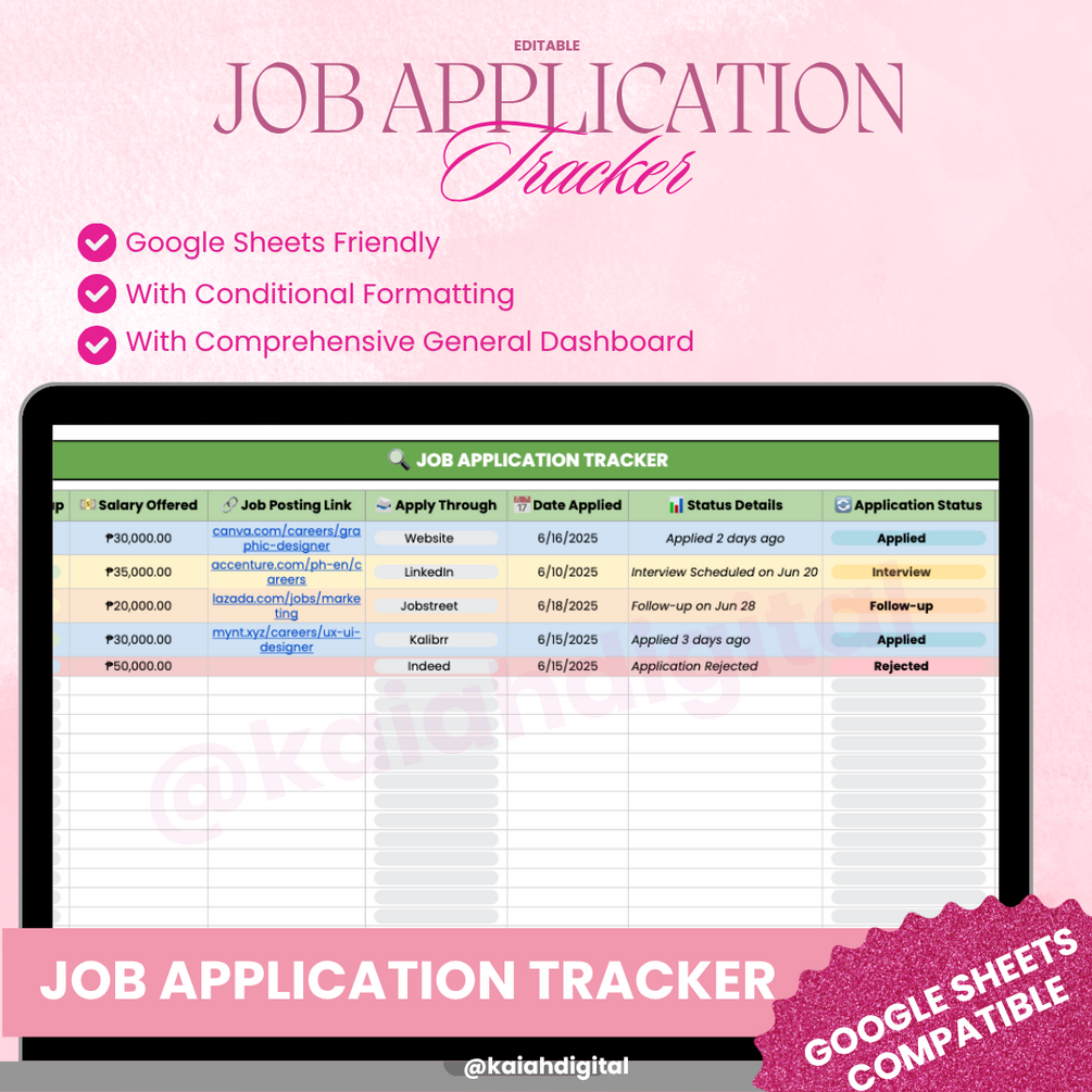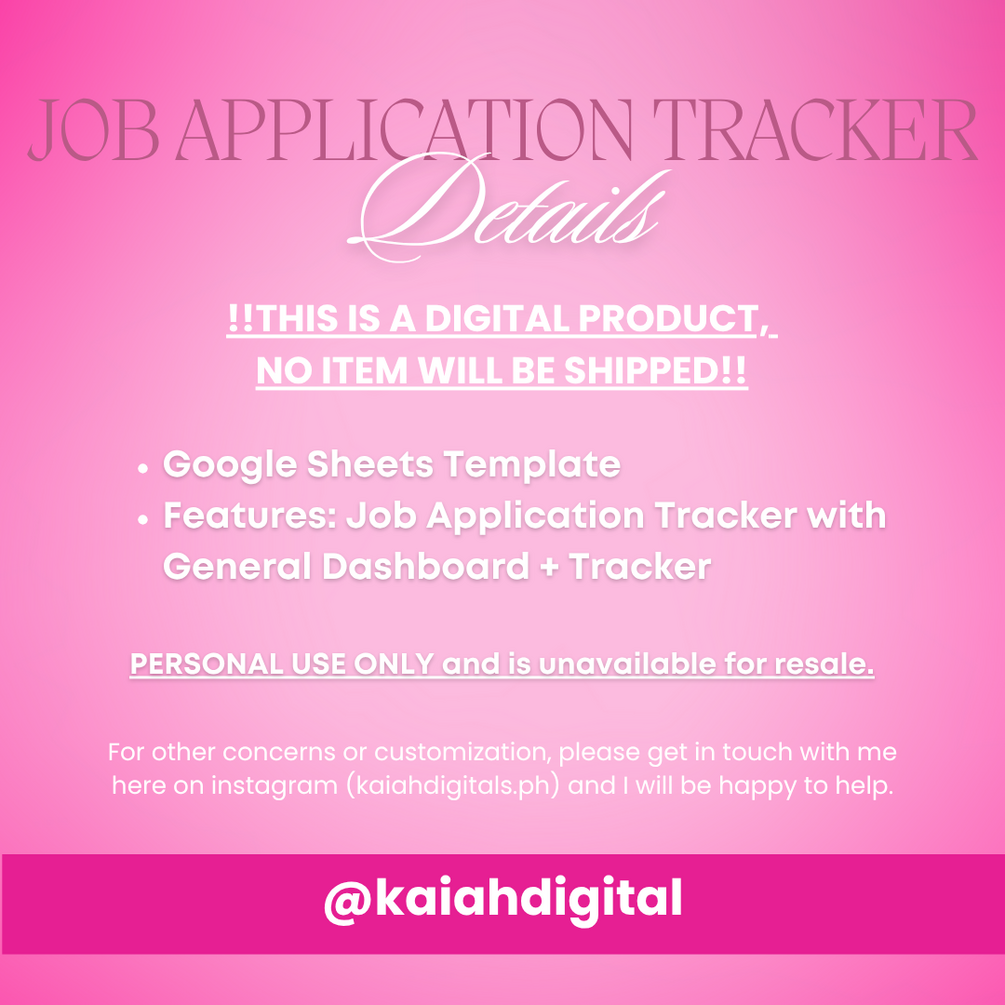 Take the stress out of your job search with this easy-to-use Job Application Tracker in Google Sheets! Designed to help you keep track of every detail—from the companies you applied to, interview dates, follow-ups, and more.